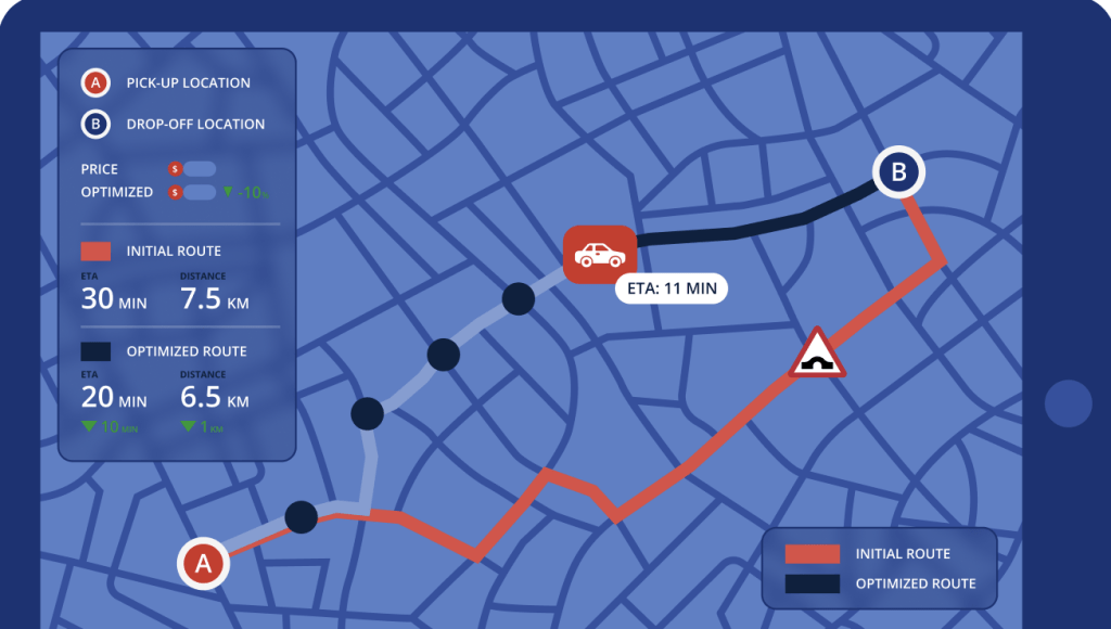 We began by implementing GIS features that offer maximum outcome with minimal implementation cost: automatic geocoding and validation of addresses and displaying them on a map,  optimal route building and visualization, and automated pricing based on the optimal route mileage and tolls. This reduced failed trips and cost expenses, improved OTP, and set the foundation for future enhancements.